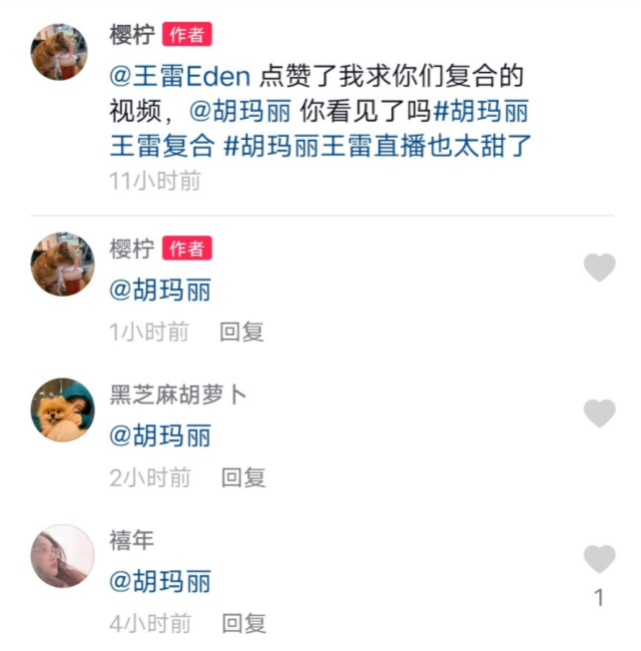 令人惊喜的是,4月2日凌晨,一位粉丝表示王雷点赞了自己发布的求二人复合的视频,网友在视频下面纷纷喊话胡玛丽,想让她也知道。通过这一举动,我们猜测王雷心里还放不下胡玛丽,是不是意味着二人有复合的可能?