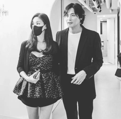 头发微卷的张东健轻轻揽着妻子纤腰,虽然夫妻俩眼神不一致,两人都没看镜头,但从肢体语言就能判断出他们非常恩爱。