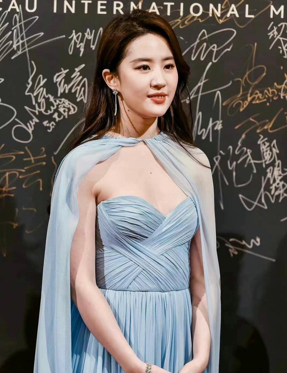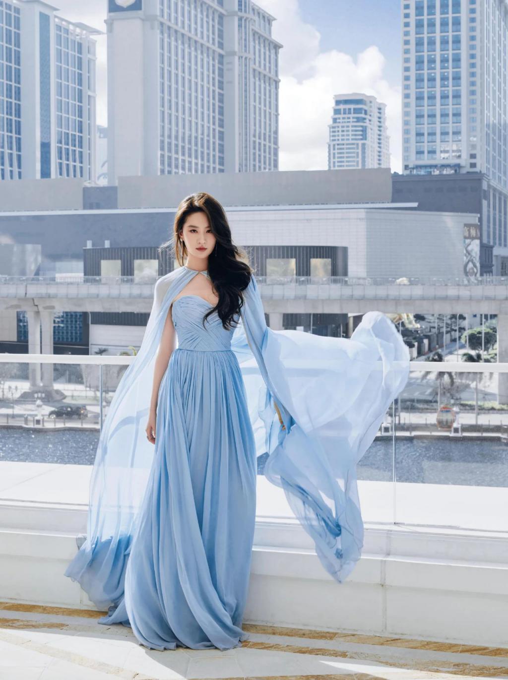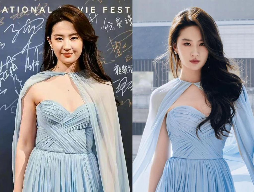 造型师给刘亦菲选的这条蓝色纱裙也很仙,既能凸显腰身,也能小秀性感,配上卷发和红唇,很符合大家对美人的想象。但万万没想到,这套造型离开精修后,还是有点落差的。