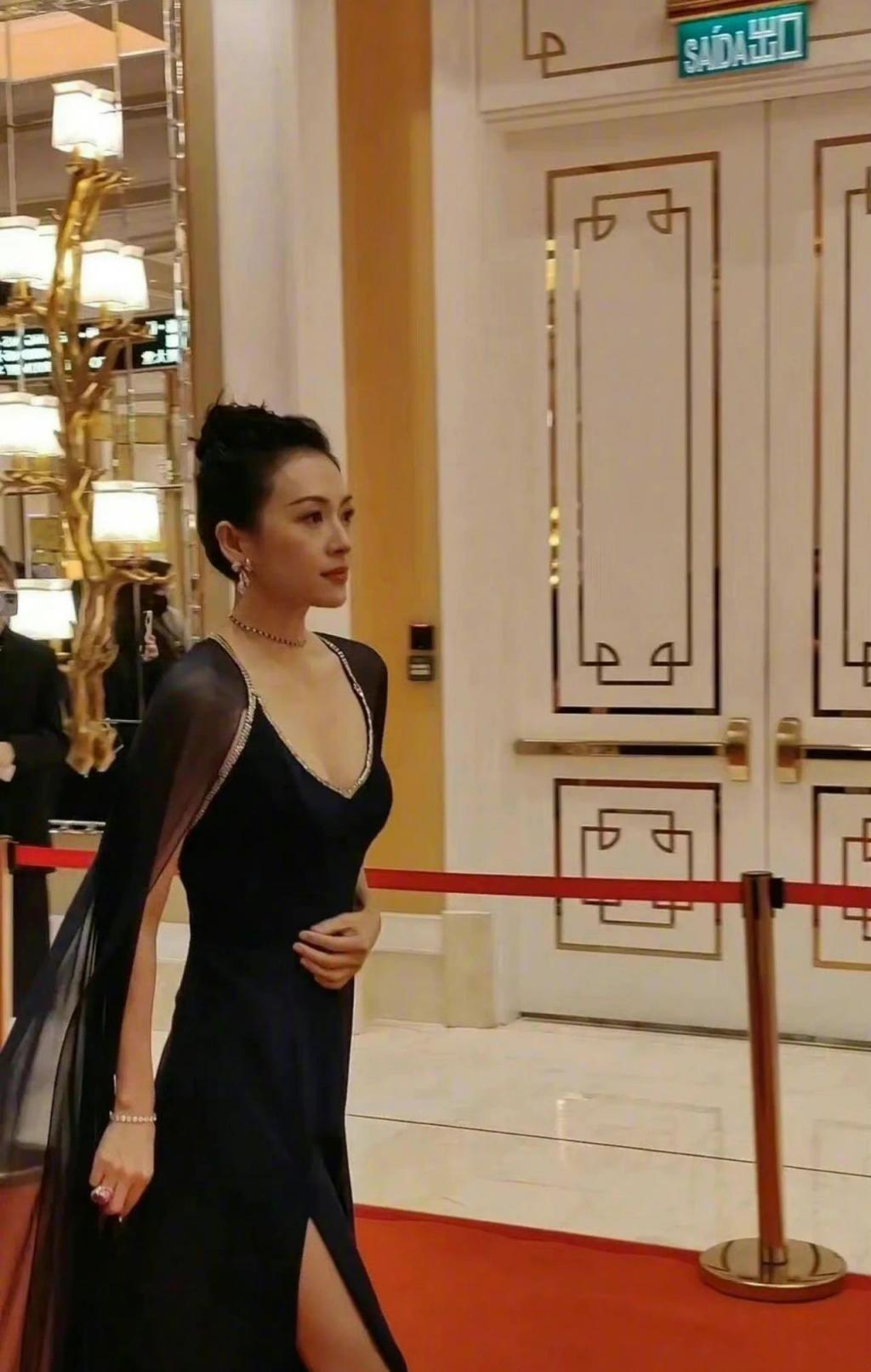 今年 43 岁的章子怡生过两个孩子,但生图里的身材还是维持得很好,20+ 的时候是这样,现在 40+ 了还是这样,想必私底下一定做了很多努力。如果没有纤瘦的身材,估计真没办法轻松驾驭这条深 V 高开叉蓝色吊带长裙。当然也是因为她气质好,整体效果才会这么好。