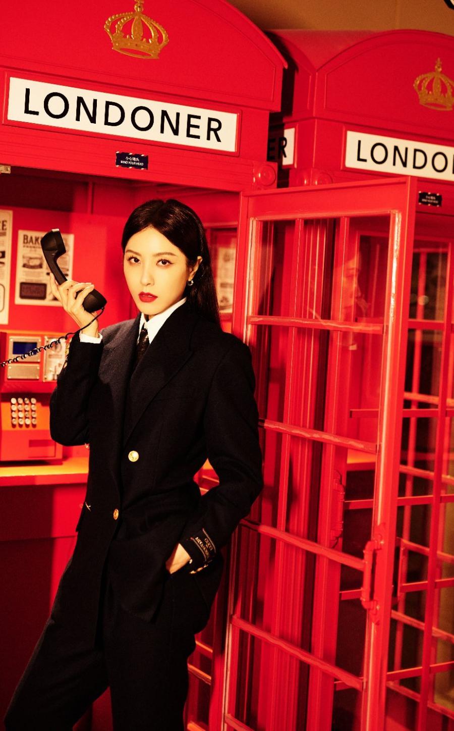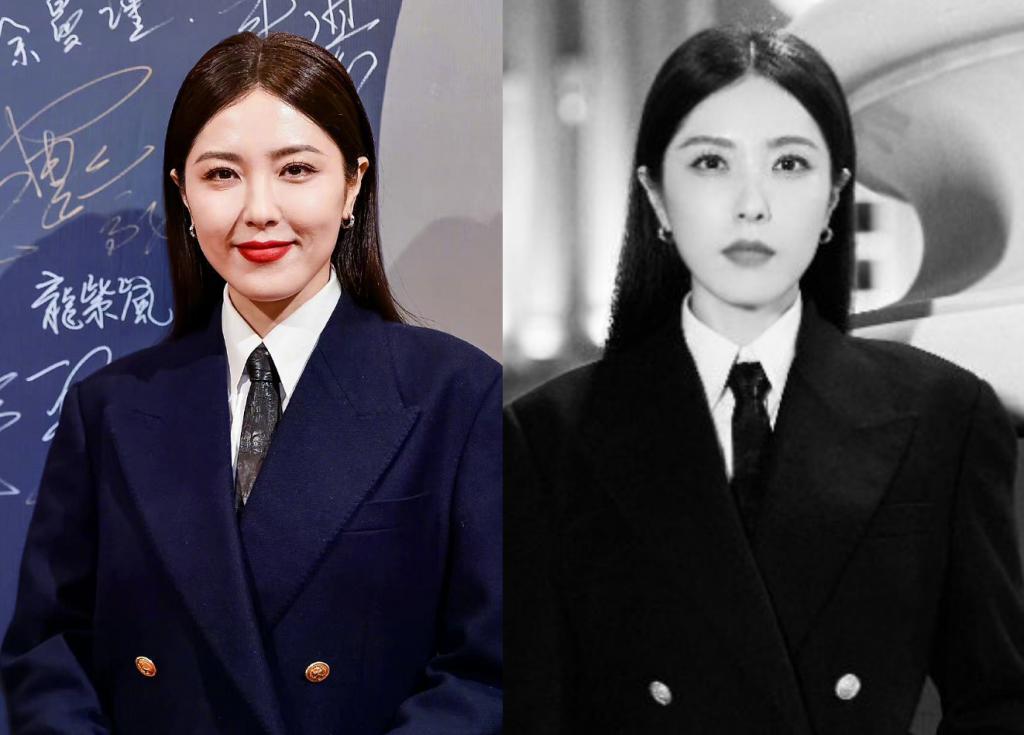 再来看曾黎,她没有穿裙子,反其道而行选了一套黑色西装套装,配上黑长直和红唇,气场全开。