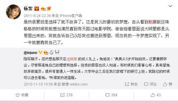 杨紫在很多采访中说过,在微博中也不避讳谈到,小时候就是因为看了《还珠格格》喜欢上赵薇,梦想着有一天当演员。