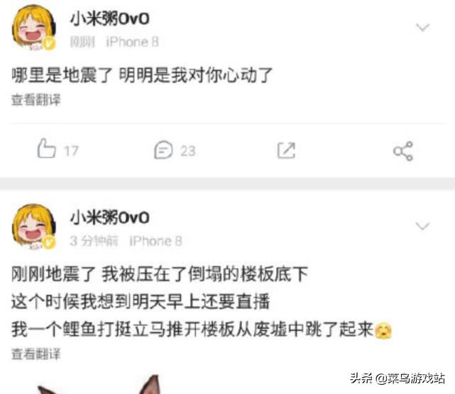 主播小米粥因为发了不正当的言论如今也是直播间被违规关闭了,说难听点就是被斗鱼封了。那么到底主播小米粥发了什么言论会被斗鱼做出这么严重的惩罚呢?看到她微博发的才知道,原来是拿地震来开玩笑,下面是小米粥发文原话:“刚刚地震了,我被压在了倒塌的楼板底下,这个时候我想到明天早上还要继续直播,我一个鲤鱼打挺立马推开楼板从废墟中跳了出来”随后小米粥又补了一条:“那里是地震,明明是我对你动心了”,看完之后也是让非常多的网友感到气愤,粉丝也表示活该被封,网友们也说不用去可怜她。