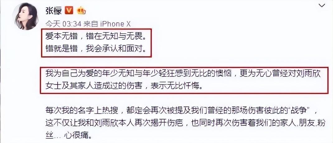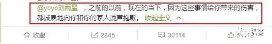 说自己错在年幼无知年少轻狂,错在天蝎座被爱冲昏头,自己很自责很后悔很害怕,要给刘雨欣说一句迟来的道歉。