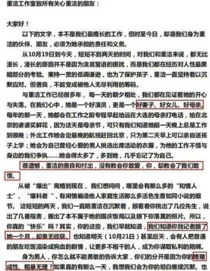 2012年,董洁率先发文称丈夫潘粤明又爱赌又爱喝酒,喝多了还会家暴她。