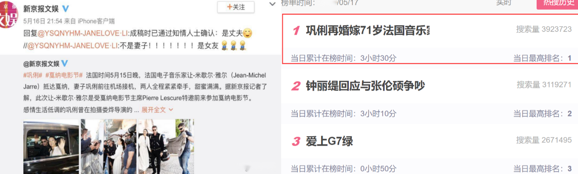 不到一天,巩俐再婚71岁法国音乐家的消息,便登上热搜第一。就连新京报,也专门为两人的爱情深夜发文证实,他们是夫妻。