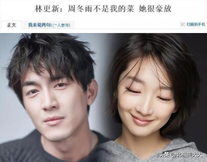 可谁也没想到,娱乐圈的恋情保鲜期这么短,仅过了两个月,林更新就急忙撇清了自己和周冬雨的关系,表示周冬雨不是自己的菜,两人只是“好哥们”。