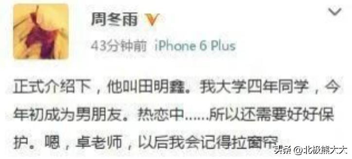 田明鑫是周冬雨的大学同学,周冬雨在社交平台上坦言,两人是今年年初才走到一起的。