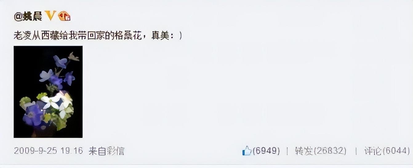 2009年,姚晨开通微博,上面写满了她和凌潇肃的甜蜜生活,一共有109次提到凌潇肃。