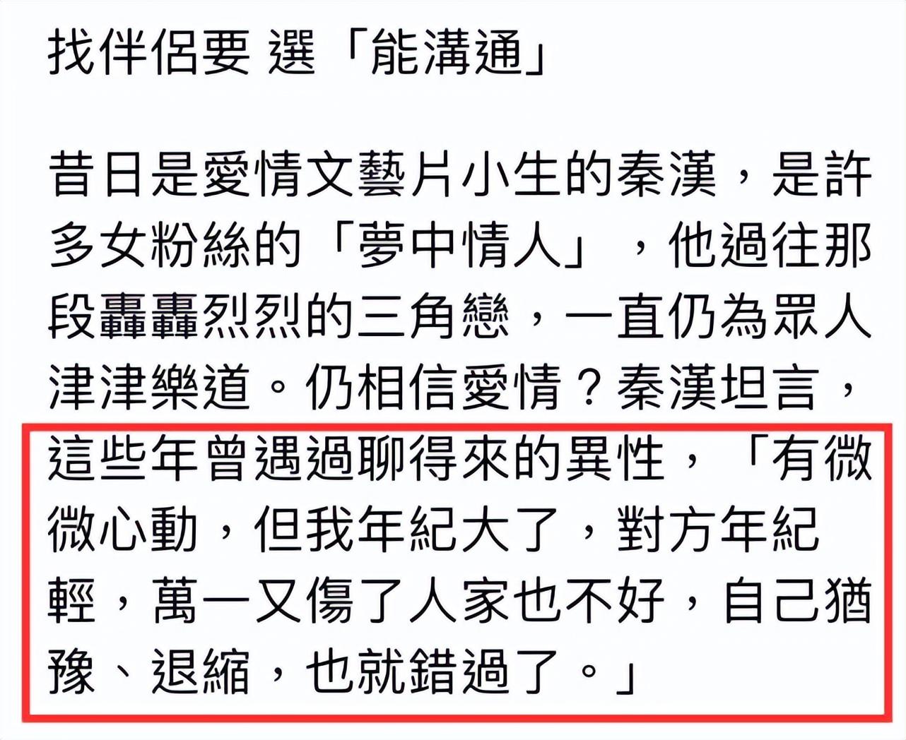 不过这次采访秦汉坦言,这些年也曾遇到过聊得来的异性,有微微心动过,但是因为自己的年纪大了而对方比较年轻,怕万一又伤了人家也不好,因为自己的犹豫、退缩,最后也就错过了。