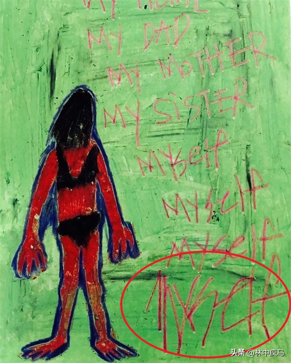这张画色彩和线条力度非常强,画面很满。旁边用英文越写越用力,逐渐情绪激动,最后一个Mself越看越像Help。