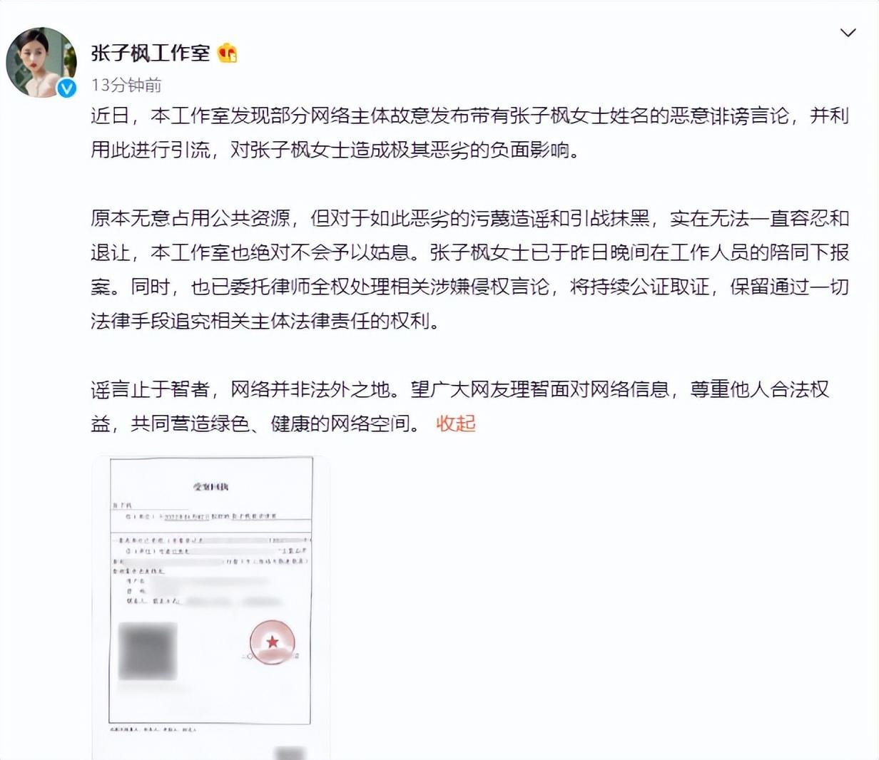 4月8日,张子枫工作室发布通知,针对网上传出的对张子枫有恶意诽谤的言论,已经进行报案处理,并晒出了报案回执单。