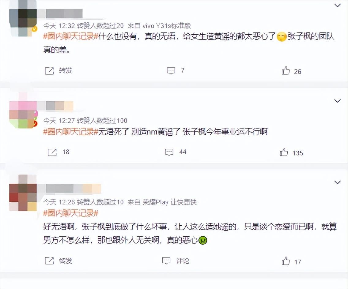 4月7日,微博上关于“圈内聊天记录”的词条超过了上百万人阅读,多人参与讨论,甚至还登顶热搜。许多粉丝纷纷为张子枫打抱不平,认为给女生造“黄谣”的举动非常恶心,且具有很大的主观恶意。