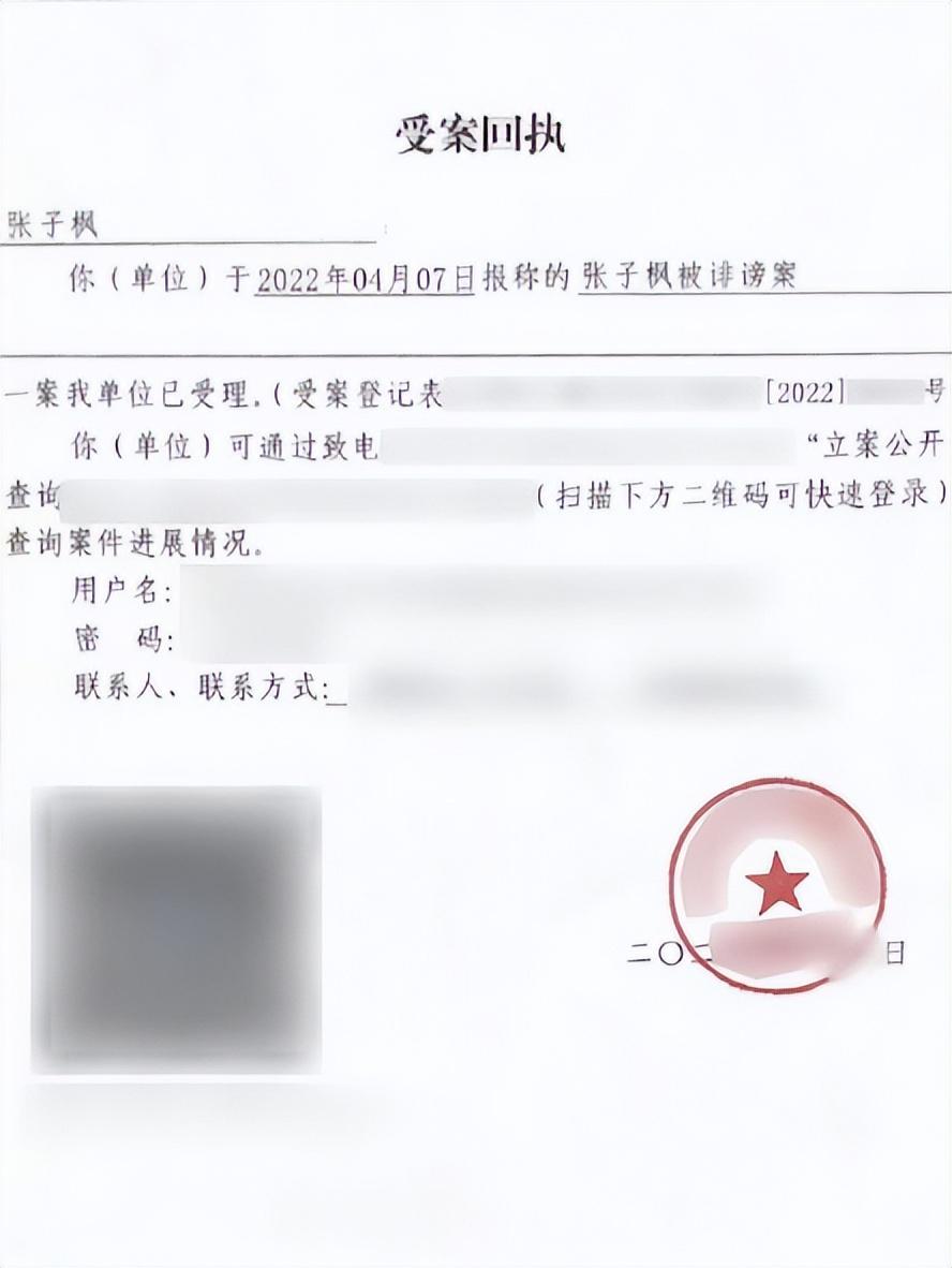 在回执单上清楚地写道,张子枫本人于2022年4月7日到警局报案,罪名为“张子枫被诽谤案”,相关单位已经受理。
