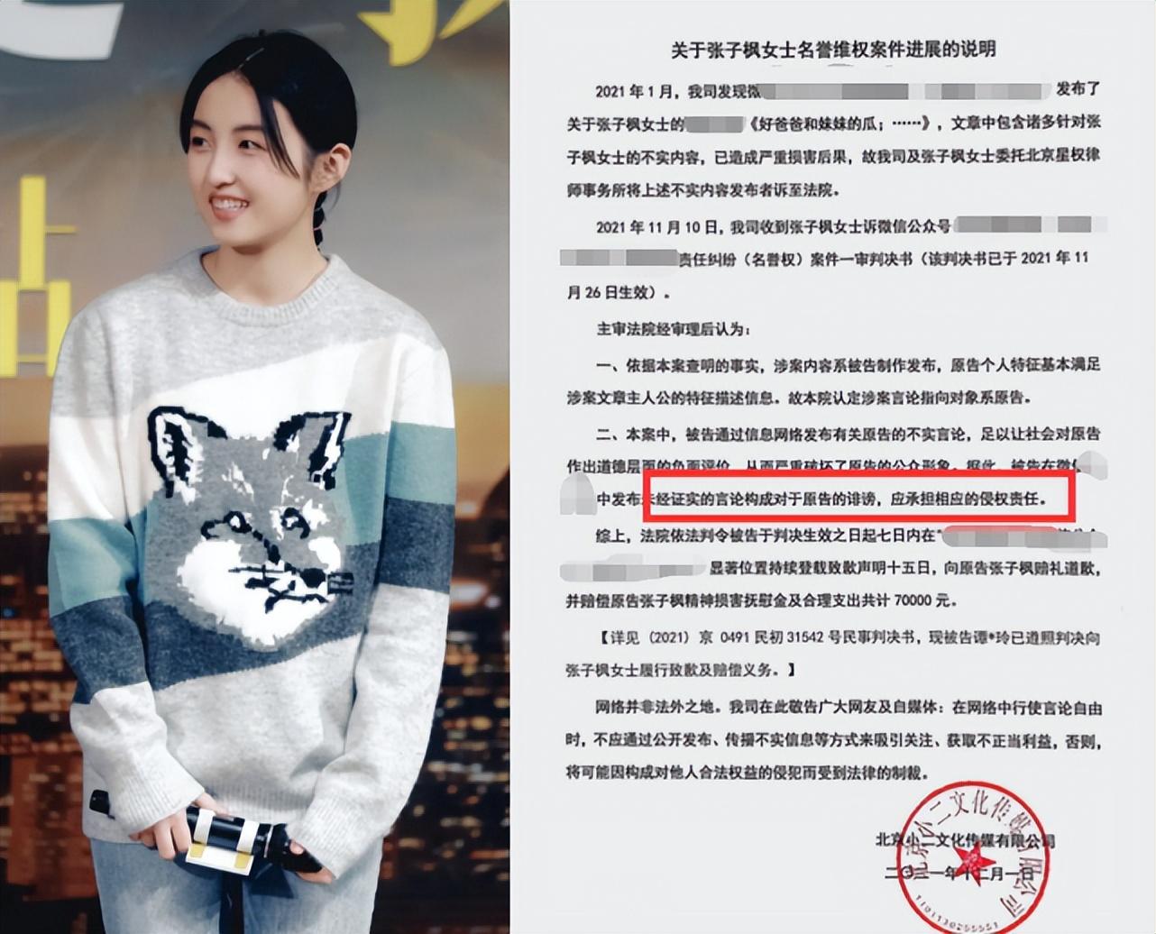 其实,这已经不是第一次了。此前就有网友凭空捏造张子枫的瓜,甚至还牵扯到了圈内其他明星,张子枫团队直接起诉对方。造谣者被判定诽谤罪,刊登了15日的道歉声明,并向张子枫赔礼道歉,还赔偿了精神损害抚慰金以及合理支出共计70000元。