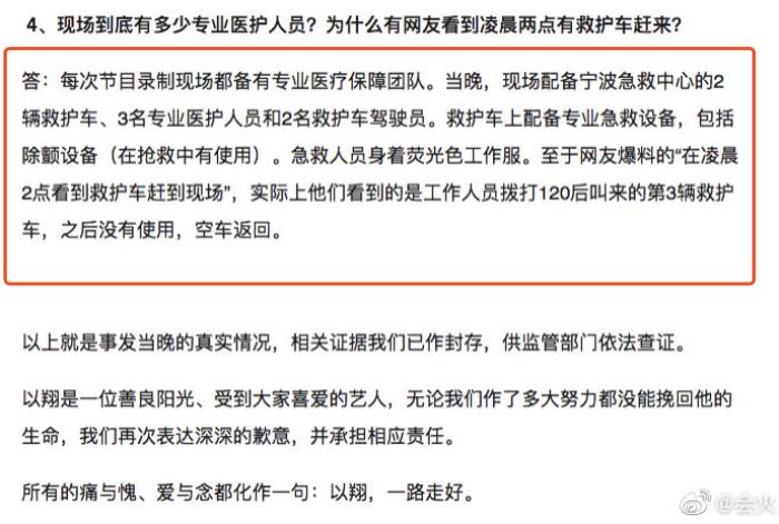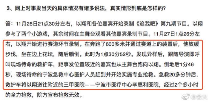 还有人称是节目组错过了黄金救治时间、节目强度太大、节目组没有配置专业的救援人员。这类声音从高以翔逝世到现在并没有停止,高以翔粉丝还整理出"二十四问浙江卫视"的文档,以至于很多人都把矛头指向了节目组。