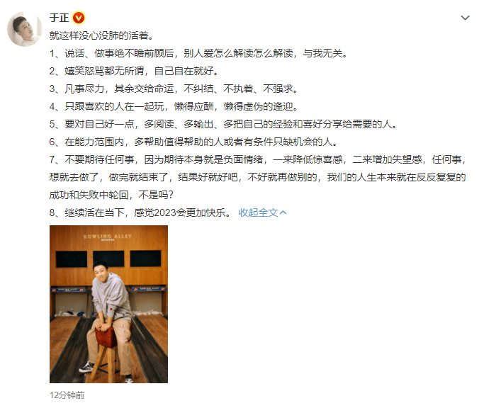 于正发长文感叹要继续活在当下:感觉2023会更加快乐