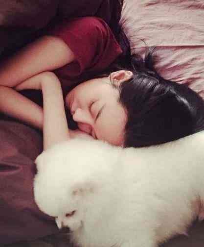 另一张照片也很有看点,张馨予 侧卧在床上,双手交叉,眼睛闭起来似乎是在睡觉,她的侧脸真的非常好看,眉毛、眼睛、鼻子简直是完美搭配 。但是 图上的另一东西亮了,就是张馨予的头顶,睡着一只可爱的小比熊,这只小狗是张馨予养了许多年的宠物,张馨予非常爱它,一人一狗靠着睡觉有一种岁月静好的感觉。