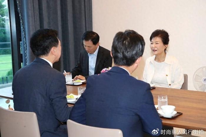 朴槿惠脸上竟然都没有什么皱纹,气色非常好。她当天一身白色的造型亮相,非常清新简约的路线。