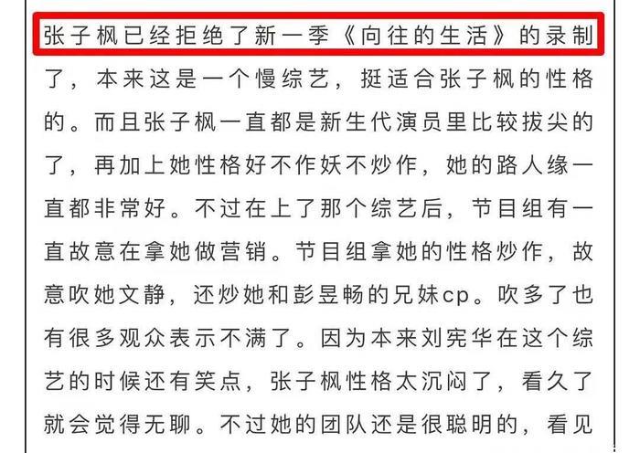 而张子枫本人及其团队对这一点非常清楚,所以不打算再参加这一季的《向往的生活》了。张子枫做不出综艺效果,所以营销点在她的性格文静以及和彭昱畅的兄妹关系上,然而这些若放在刚开始或许还能带动热度,但是看多了观众也会有疲劳。