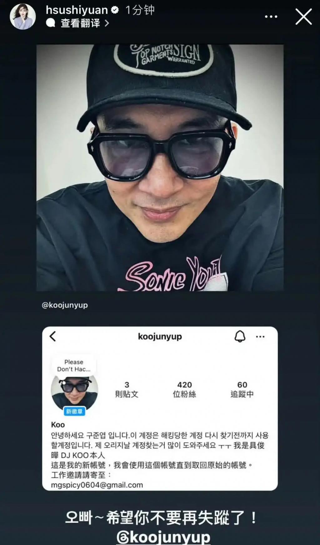 近日,具俊晔 ins 被盗后开通新账号,大 S 晒动态为老公宣传,并配文称:" 希望你不要再失踪了!"