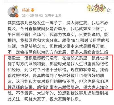对于未来,虽然外界对杨迪与女友的分手看法不一,但他依旧保持乐观态度,声称彼此经过多年相伴,即使分开,也会继续关照对方。这样的态度让人不禁想,杨迪究竟能否在失去的感情中找到新的起点?