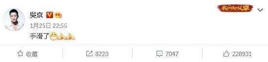 1月25日,演员吴京被发现点赞了一条列举他票房成绩和表示“只服吴京”的内容。随后,他取消了这个点赞,并发文称:“手滑了。”