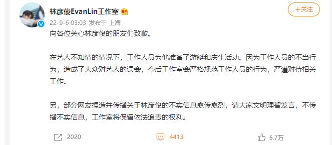 林彦俊工作室也赶在林彦俊声明发出后三分钟发声,一改早前的强势话锋,认定林彦俊流连牌桌是误会,因为工作人员为其准备了游艇和庆生,其本人并不知情。