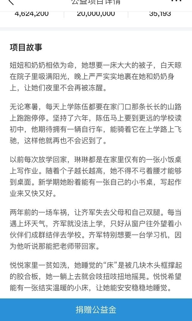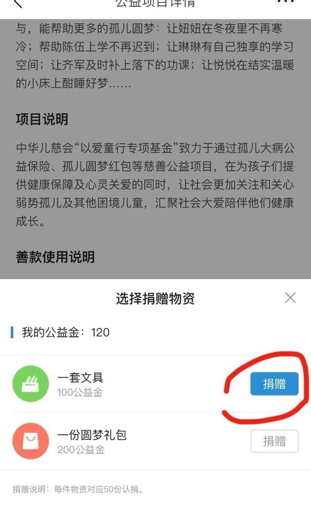 查看完项目后,点击捐赠公益金可选择不同物资进行捐赠。