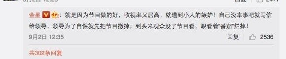 虽然官方回应是节目进行调整,但是后来金星本尊在微博犀利回复道:“真正停播的原因是因为节目做得好,收视率居高,就遭到了小人的嫉妒,自己没本事就写信给领导,领导为了自保就把节目撤掉了,到头来观众没了节目看,眼看着“番茄”烂掉!”