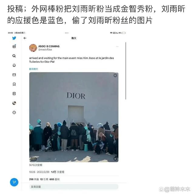 刘雨昕通过选秀节目 C 位出道,其在海外的粉丝群体也非常庞大。在看秀现场,大量粉丝携带蓝色应援物品力挺偶像,为她助推人气。但是,有网友发现金智秀的韩国粉丝直接把刘雨昕的粉丝应援据为己有,偷了刘雨昕的粉丝,照片中,应援的粉丝都穿戴着极具辨识度的蓝色标识。