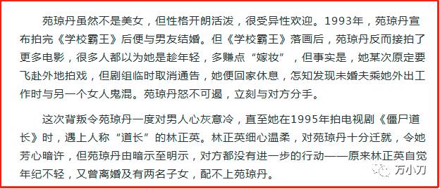 事实上,不管是朋友还是恋人,苑琼丹喜欢认真的人,这也是她与 " 僵尸道长 " 林正英那段最为人熟知的爱情的开端。