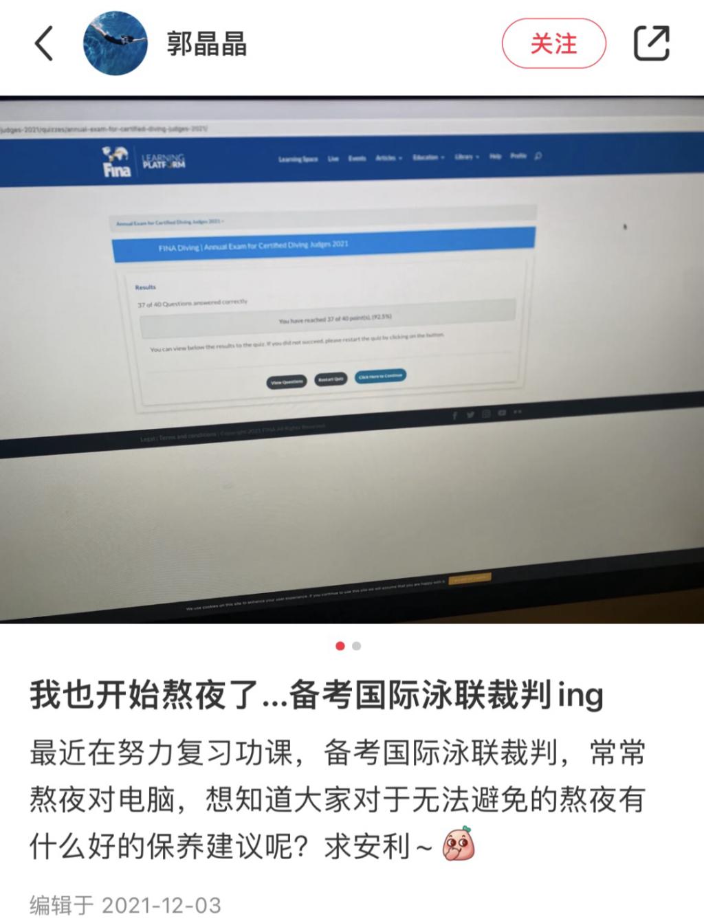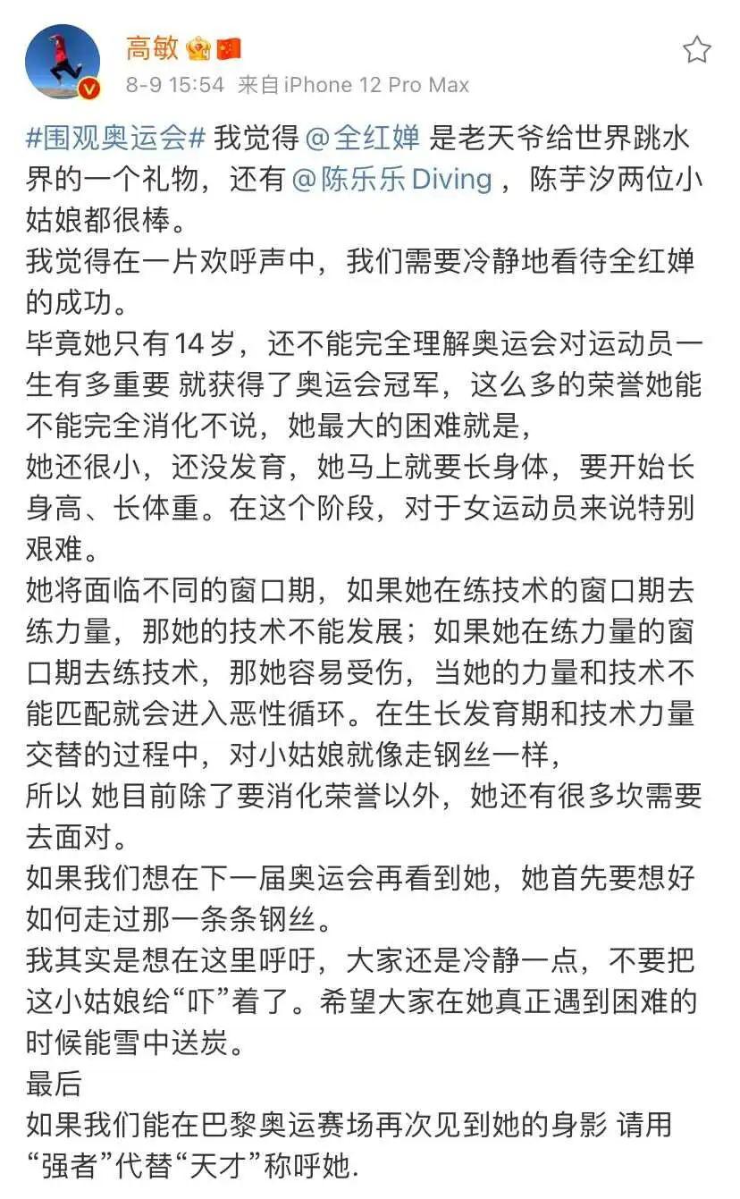 她肯定全红婵、陈芋汐两外运动员天才叙事之外的努力,