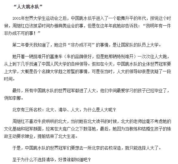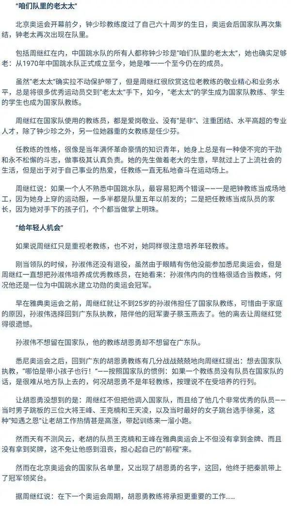 也正是这件事让周继红意识到,要想让中国跳水队在国际上取得更多的好成绩,光靠闭门造车的苦练技术是没有用的。