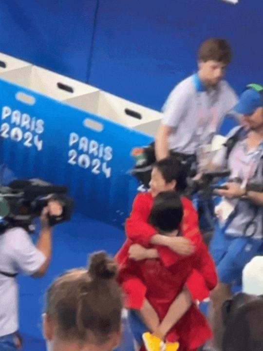 台下满眼爱意地为要参赛的全红婵、陈芋汐两位小将拍照,