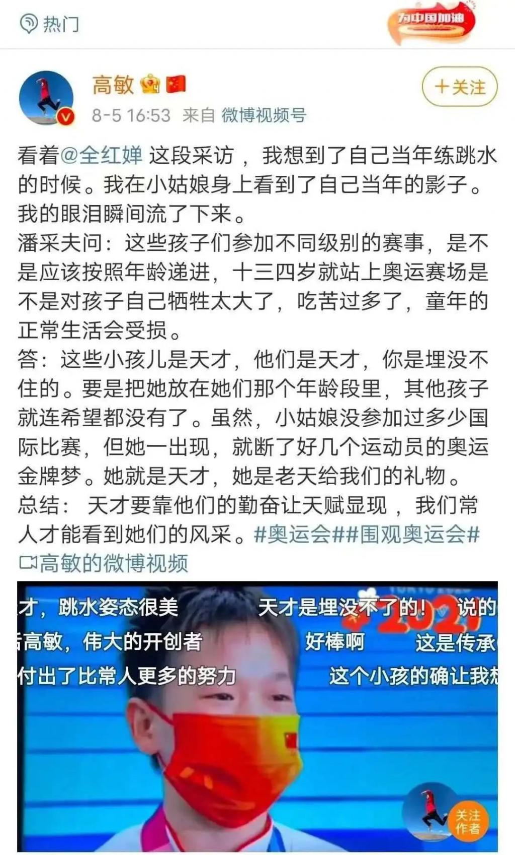跳水界的另一位大前辈吴敏霞,也表达了同样的关注。