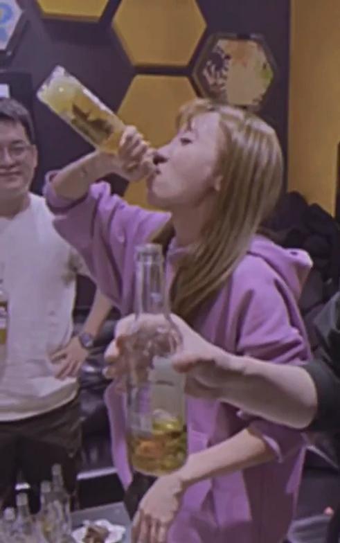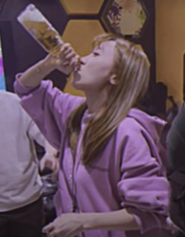 当天,毕滢穿着一件紫色连帽的卫衣,一头黄色长发披肩,看起来青春又充满活力,不过这个发色看起来有些一言难尽。在朋友的起哄下,毕滢挽着袖子单手叉腰,对瓶吹啤酒,很快一瓶就喝了干净,身旁的男性朋友还拍了拍她的肩膀,似乎有点担心。
