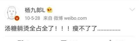 杨九郎:“汤糖躺烫全占全了!!!瘦不了了…………。”一个2010年对自己绝望的人,居然在2018年瘦成了连男粉都要给他生孩子的九郎。造化弄人啊。