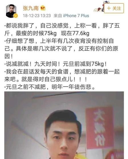 张九南:“元旦之前不减肥,明年一年徒伤悲。”在2018年的12月23日,张九南发的微博说自己胖了五斤,还回忆起自己上半年有几次吃了宵夜,男人可以对自己多狠?居然能够记得自己破戒的那几次宵夜,对于我们来说,宵夜就是日常好吗?