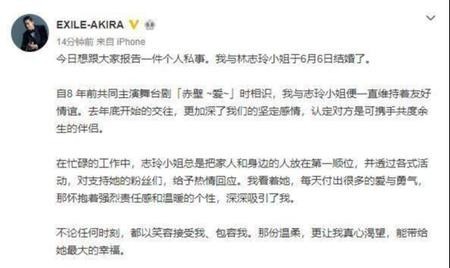 两人相识于2011年,AKIRA与林志玲因合作主演舞台剧《赤壁~爱~》而相识。但直到2025年底,二人才开始交往。6月6日,这份迟来的爱情,在对的时间,终于开花结果。