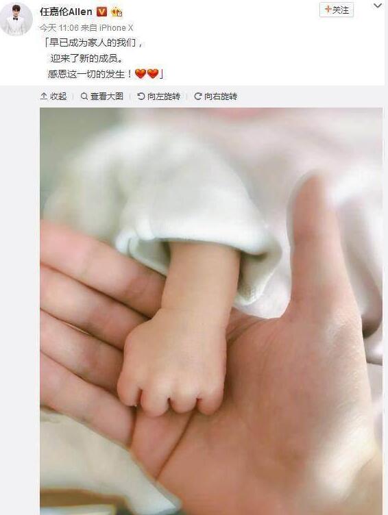 而就在后脚,刚与女友宣布恋情的任嘉伦也晒出孩子的小手宣布正式升级当爹,让很多人误会,任嘉伦的老婆是毛俊杰,后来证实,任嘉伦生的是男孩,而且他的老婆是聂欢。