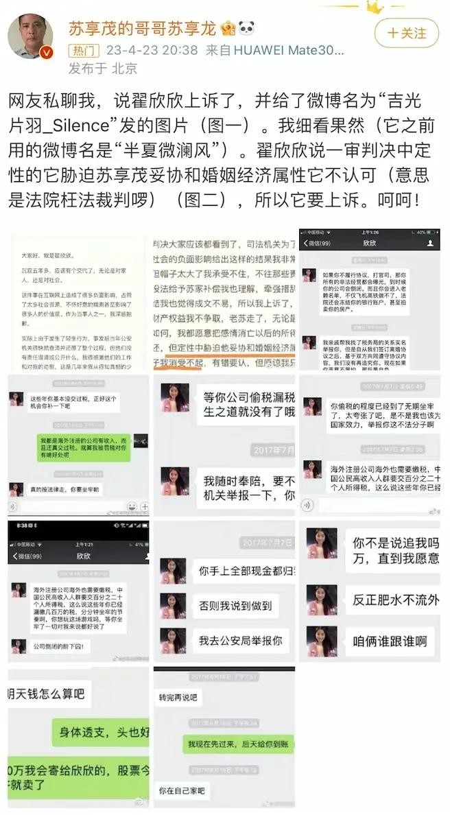 就在当年的9月9日,苏享茂的哥哥苏享龙通过实名认证的微博发布消息称,这些内容都属实的,他说在苏享茂短暂的婚姻存续期间,弟弟为翟欣欣购买海南清水湾住房一栋,特斯拉电动汽车一台,多次汇款,累计花费近1300万元。