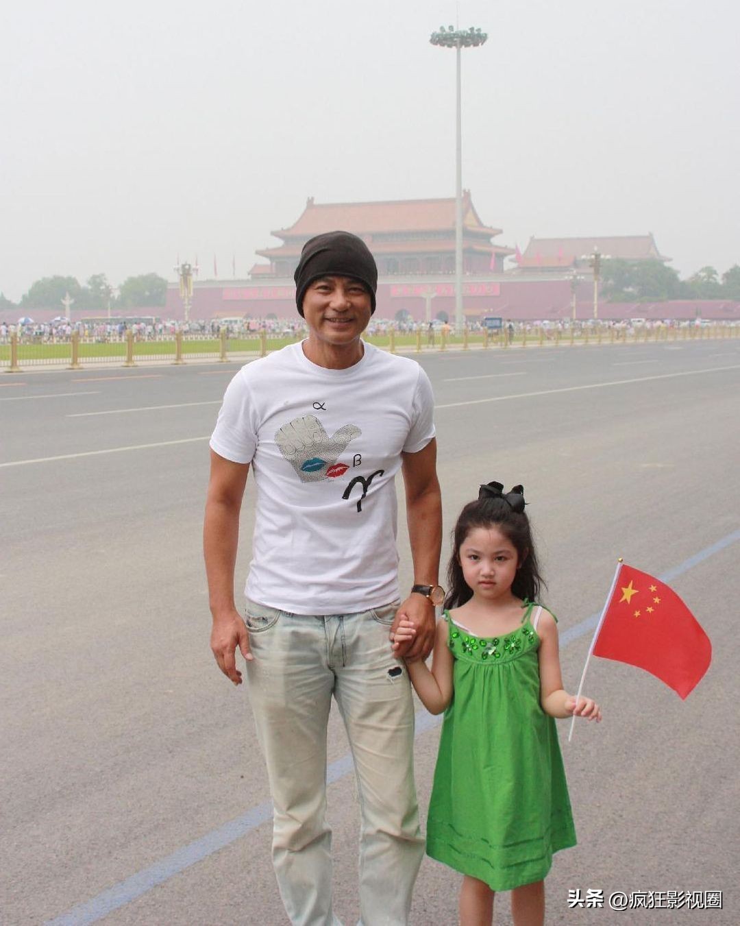 任达华带着小时候的女儿任晴佳在北京旅游,手拿小五星红旗的任晴佳,微笑面对镜头,显得非常漂亮可爱,可见任达华从小就对女儿有爱国教育。