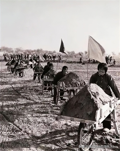 年轻的女知青们顶着炽热的太阳,奋力推着独轮车,不知疲倦地运送土壤。他们的热情与汗水融为一体,活力四溢。