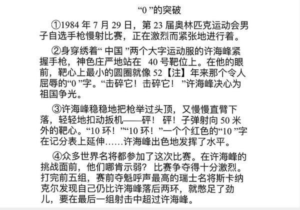 冯雅娜介绍:“1984年,他在洛杉矶奥运会上以566环夺得男子手枪60发慢射冠军,成为本届奥运会首金得主,同时也是中国首位奥运冠军,实现了中国奥运会历史上金牌‘零’的突破。我们指导学生做题的时候,在文章中许海峰的动作描写,神态描写,还有许海峰在当时比赛中,面对世界名将激烈竞争,他所承受的压力、困难,这种精神就是勇于挑战拼搏,也是激励学生不怕困难,努力实现自己的目标而奋斗。”