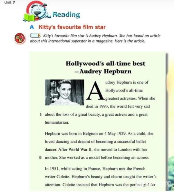不仅如此,一些文艺明星包括成龙、谭盾等也曾出现在阅读文章里,英国女演员奥黛丽赫本的故事则编入九年级上册英语课文中。南京市金陵中学集团人民中学英语老师王雪霞说,这一单元主要介绍慈善志愿者活动,还有关于电影题材等内容。