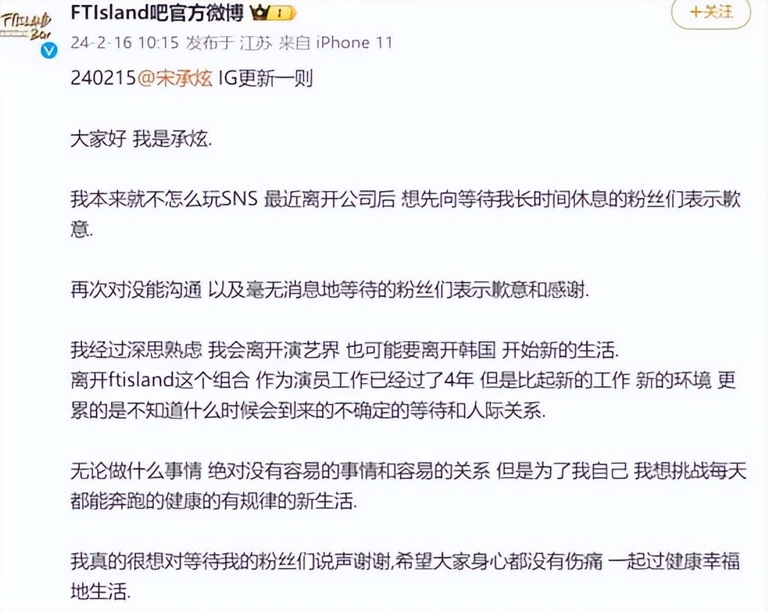 韩国娱乐圈一向是充满着明星耀眼光芒的舞台,然而最近一则消息却将这个璀璨的舞台上的一抹浓墨,那就是前知名男子组合FTISLAND成员宋承炫宣布退出娱乐圈并继承未婚妻家业。