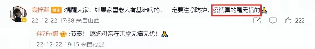 如果没有疫情,高梓淇的母亲还可以继续享受到天伦之乐。而如今她与儿子则是天人永隔。高梓淇母亲这样的情况并不是个例,最近还有很多老人因疫情离世。高梓淇在评论区也提醒大家,家里老人有基础病的,一定要注意防护,疫情真的是无情的。