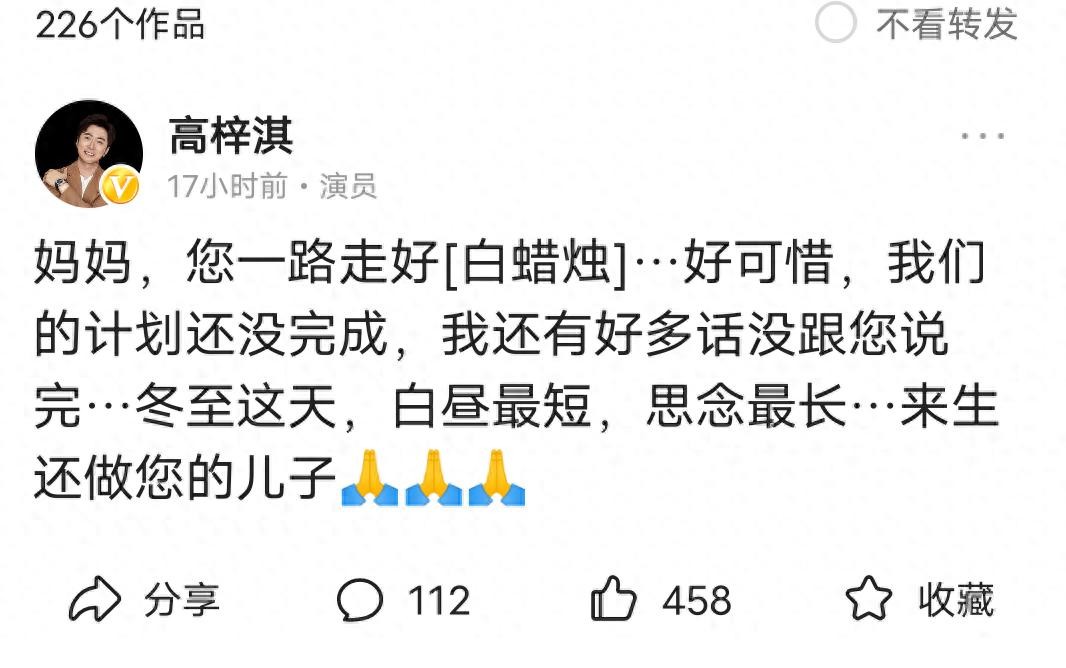 高梓淇在社交媒体写道“妈妈,您一路走好,好可惜,我们的计划还没完成,我还有很多话没和您说完,冬至这天,白昼最短,思念最长,来生还做您的儿子。”