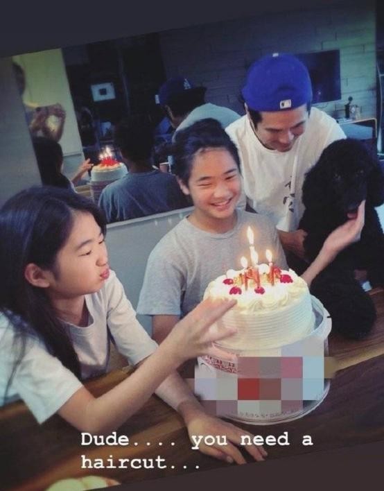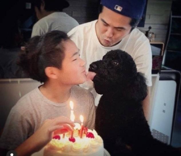 从照片中可以看出13岁的joe身穿灰色短袖出镜,他身上多了些少年气概,五官与父亲曹格非常相似,但joe与小时候相比皮肤黑了许多,他把头发扎了起来,打扮的很个性。曹格则身穿白色上衣,戴着蓝色鸭舌帽,手中抱着狗狗,一家人非常温馨。